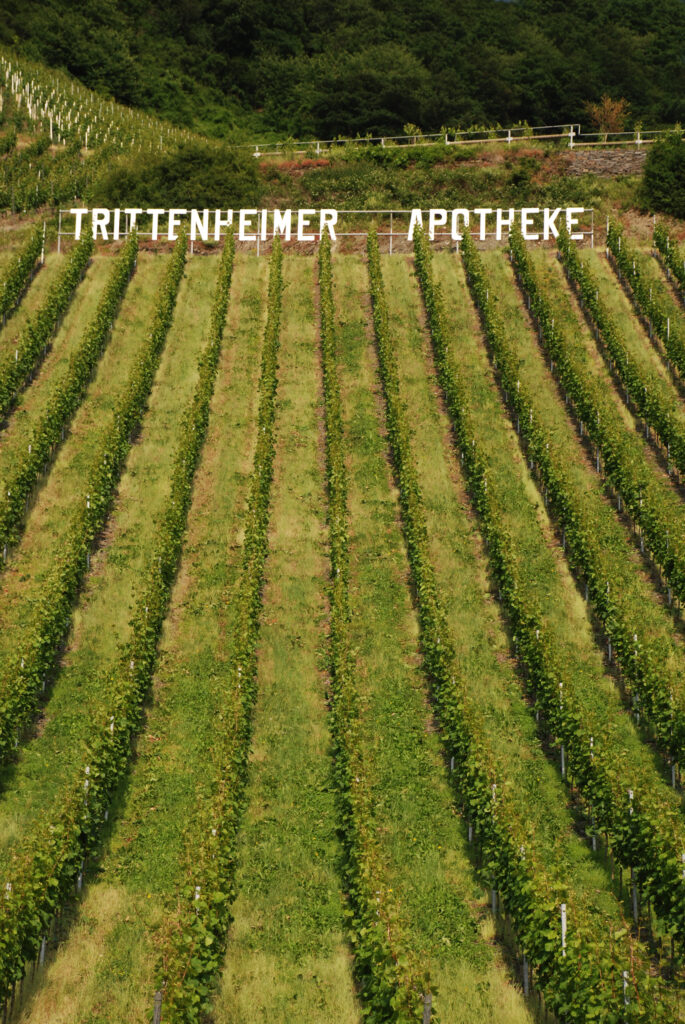 Trittenheimer Apotheke, der fast alpine Steilhang gegenüber von Trittenheim hat einen verwitterten, blau-grauen Devonschieferboden mit Quarziten. Diese Steillage hat eine West-Südwest-Exposition und bekommt bis in die späten Abendstunden Sonne. Besonders durch den sehr hohen Anteil über 60 Jahre alter Rebbestände, die tief in den Schiefer verwurzelt sind, erhalten die Weine ihre unverwechselbare, salzige Mineralität und Eleganz.